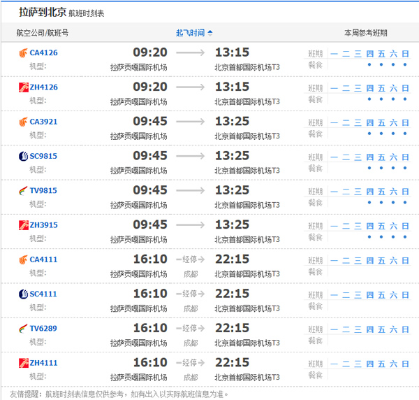 拉薩飛北京的直達航班有4個,主要航班號有中國國航CA3915、CA4111,深圳航空ZH4111,更多詳細的直達航班時刻表如下圖所示: